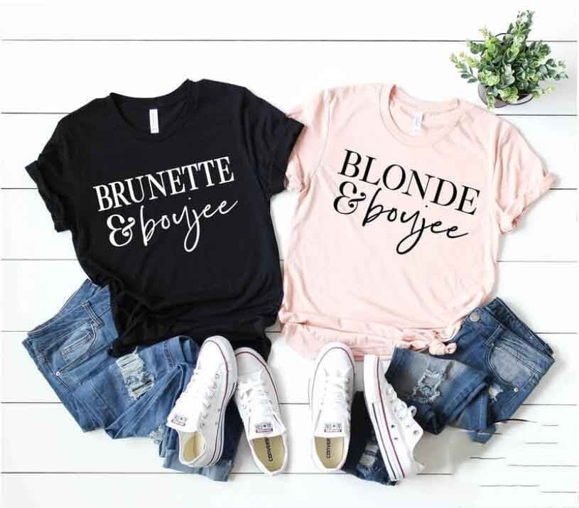 Notre T-Shirt Pour Meilleures Amies Brune et Blonde se décline en 2 couleurs distinctes pour différencier le t-shirt de la brune et celui de la blonde ! Le premier t-shirt porte le slogan « Brunette & Boujee« , qui signifie « Brunette & Classe« . Le second t-shirt arbore le slogan « Blonde & Boujee« , se traduisant par « Blonde & Classe« .