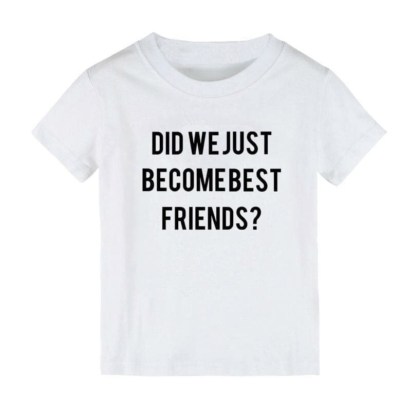 Notre Tee Shirt Meilleure Amie Enfant est disponible en deux versions. Le modèle 1 comporte le texte : « Did we just become best friends? » tandis que le modèle 2 affiche « YEP! » (« Oui »).